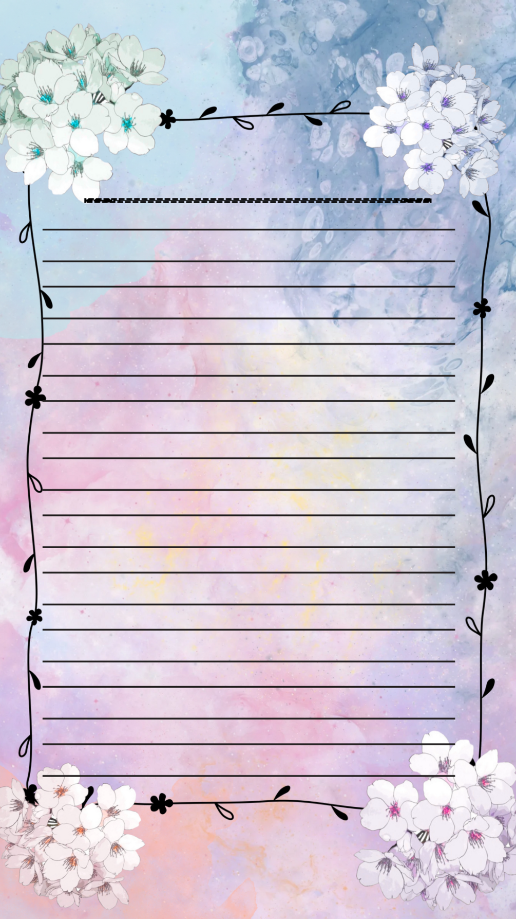 This beautiful floral-themed lined paper features a dreamy pastel watercolor background blending soft shades of pink, blue, and purple. Delicate black borders with whimsical vines and floral accents frame the page, while elegant white blossoms decorate each corner—creating a gentle, calming aesthetic. Perfect for journaling, note-taking, letter writing, or digital scrapbooking. Ideal for anyone who loves soft, feminine stationery with an artistic touch.